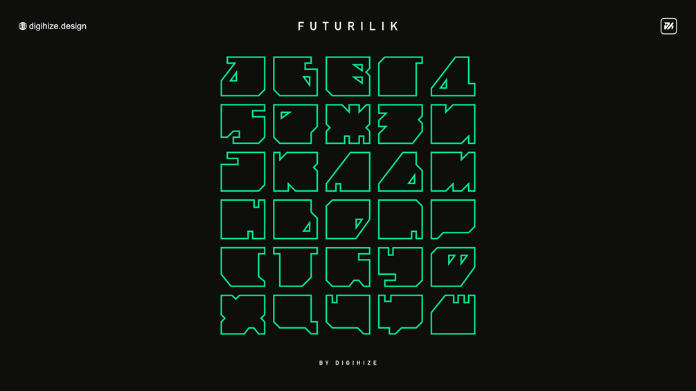 Inspired by a futuristic/cyberpunk aesthetic, Futurilik can be a great asset in a game or movie universe. Due to the abstract design of the letters, they can also be used as symbols, various marks, etc.